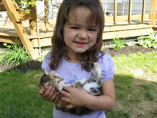 We left early Saturday morning to head over to Lawshee, Ohio - population 200 - give or take. We made it there in about 3 hours and the first thing we got to see when we arrived were KITTENS!! There were 5, 3 week old little kittens. This sparked "Mommy, can we have one?", "Puuuuulllllleeeeaaase can we have just ONE?". I finally said sure, but you have to give away either Daisy or Molly. That ended the conversation quickly because they love Daisy and Molly. We decided to venture out and go to the Peterson (my mom's family) train trussel. I kept calling it a train trellis - LOL. We all piled in the back of Cecelia's (my moms best friend) truck and headed over. What rednecks we were!! It was me, Steve, the girls, Dialycia (my niece), My mom, 2 of my uncles, my aunt and a dog in the back and another dog in the front seat with Cecelia. My little city girls adapted to the country quite well I must say (much easier than their Mommy). They had no fear and walked across the trussel without missing a beat, then went down and scouted out things along the creeks bank. Dialycia found a live mussel and Ava found a live frog. Ava played with that frog the entire time we were there. The men all skipped rocks across the creek - and it was just a peaceful, beautiful time. We loaded up in the truck to head home and I noticed Ava had a mussel shell with her holding it with both hands. I asked what she had and she replied "a frog house". She had put her frog inside of the empty shell. I didn't take my digital camera on this venture but Dialycia got a great picture of Ava and her new friend on Mom's camera.